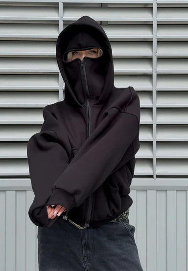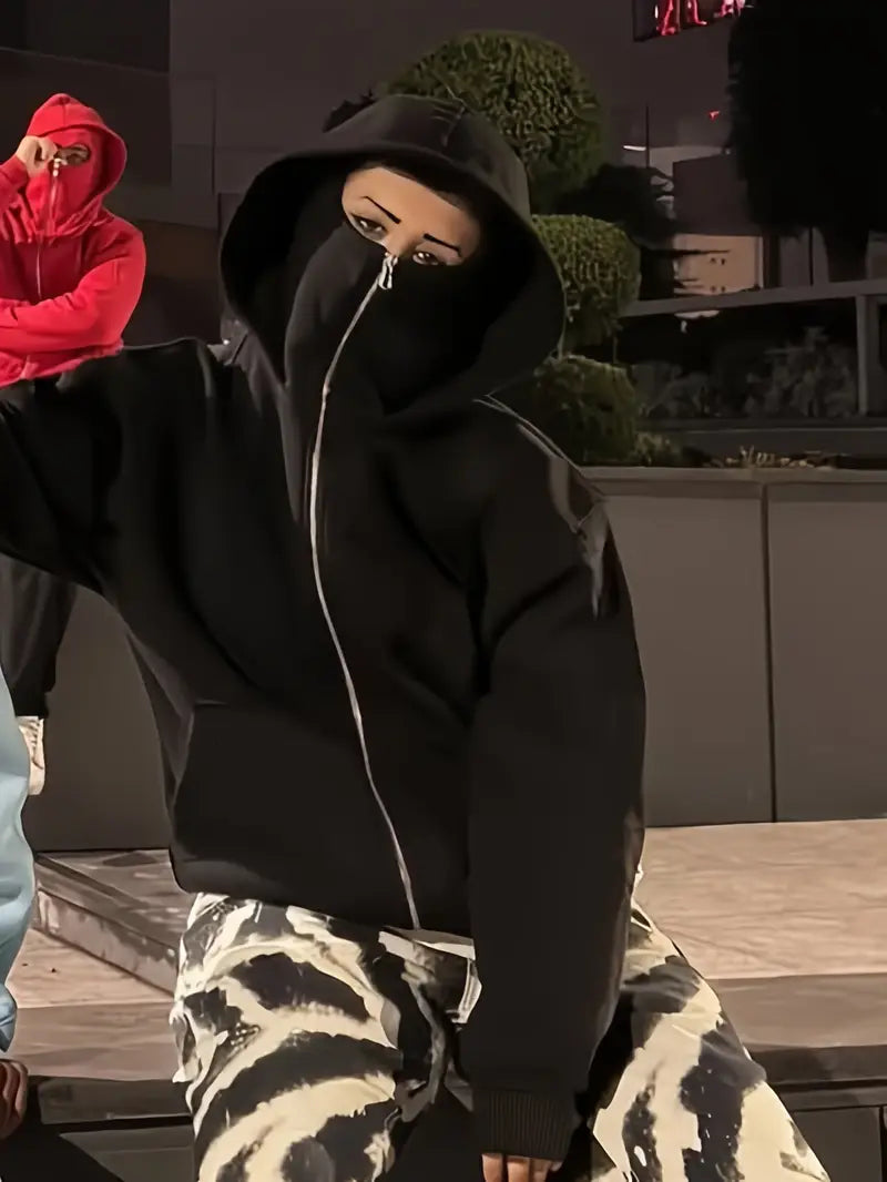 A full-length zipper extends all the way through the hood, transforming it into a complete face cover with adjustable visibility for eyes and face. Perfect for moments when you want anonymity, coziness, or simply bold streetwear style.